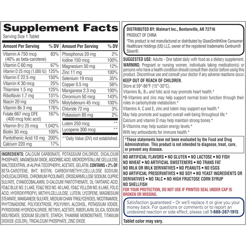 Generic Equate Mature Adult 50+ One Daily Complete Multivitamin Compare to Centrum Silver (400 Ct)