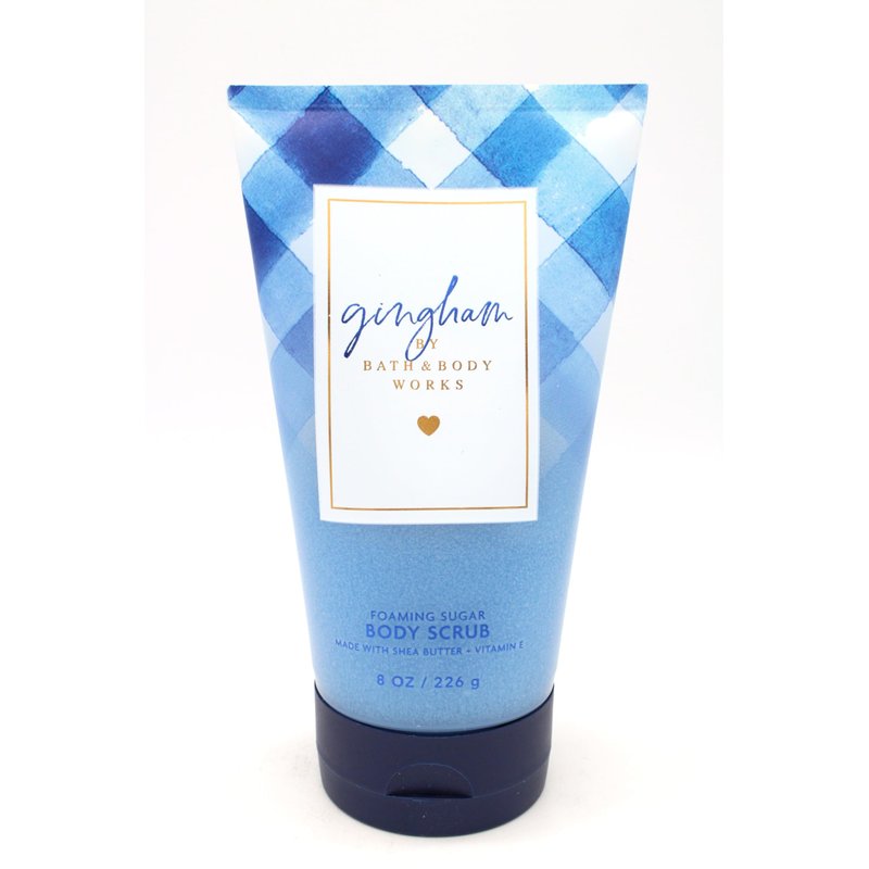 Fragrance: Gingham / Fragrance Notes: Blue Freesia, White Peach, Fresh Clementine, Violet, Clean Musk / Foaming Sugar Body Scrub with Shea Butter and Sugar Exfoliants / Size: 8 oz (226 g) / Dermatologist Tested & Made without Sulfates or Parabens / Not Tested on Animals & Vegan