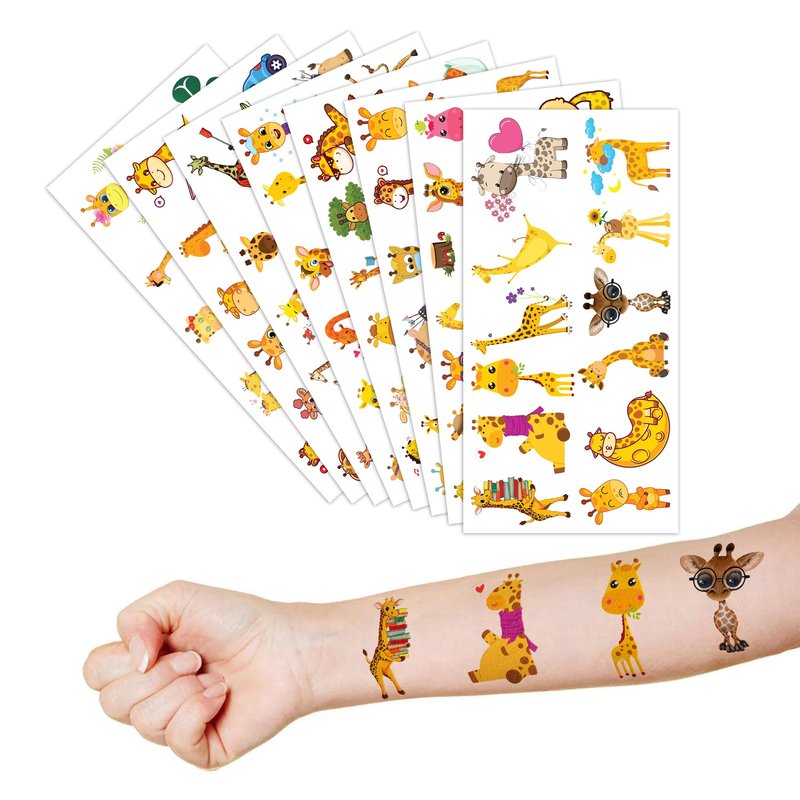 🦒【IDEAL TATTOOS FOR THEMED GIRAFFE DECOR】: This set of temporary Giraffe-themed tattoo stickers comprises 8 sheets in total, featuring a total of 96PCS striking, distinct designs. They are excellent for distributing as party favors and small gifts with a Giraffe theme for holidays. Each sheet measures 6.1 * 3.1 inches, making them suitable for boys and girls of all sizes. 🎁【FANTASTIC GIFT OPTIONS FOR GIRAFFE PARTY SUPPLIES AND DECORATIONS】: When you adorn your child's birthday party with a Giraffe theme, you'll be showered with compliments. Don't miss out on giving your boys and girls Giraffe tattoos, as they make for a wonderful small gift. 🌍【SAFE AND ECO-FRIENDLY】: Our temporary tattoos are crafted from materials that prioritize safety and environmental consciousness. These tattoos are made using paper that is both safe for users and gentle on the planet. 🥳【INJECT SOME FUN】: Fed up with ordinary gifts? We've got just the thing! Our assortment of charming and lively temporary tattoo designs can be affixed to laptops, backpacks, desks, suitcases, books, water bottles, and beyond. These whimsical touches are bound to enhance your visual surroundings and infuse a bit of happiness into your daily essentials. 🌴【SIMPLE APPLICATION AND REMOVAL】: Simply cut out each tattoo from the sheets and peel off the clear film. You can apply it to your hands, face, arms, or any area you feel comfortable. Additionally, you can place it on glasses, clothing, or a smooth flat surface. Afterward, thoroughly wet it with water and wait for 20-30 seconds before removing the backing paper. Voilà, you now have a smooth, velvety tattoo! 👍【EXCELLENT CUSTOMER SERVICE】: Should you encounter any challenges while using our product, don't hesitate to reach out to us. We are committed to resolving any issues and ensuring you have an exceptional shopping experience.