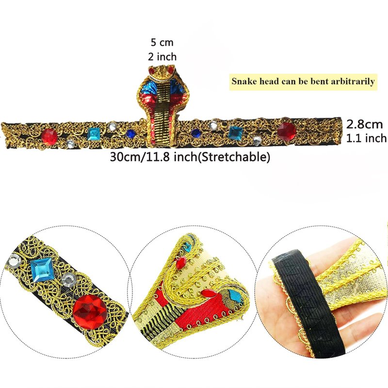 - There is an Egyptian style costume headband set. Made of good material, with comfortable touch feeling. The color and elements create a Halloween atmosphere, every detail is beautiful and special.