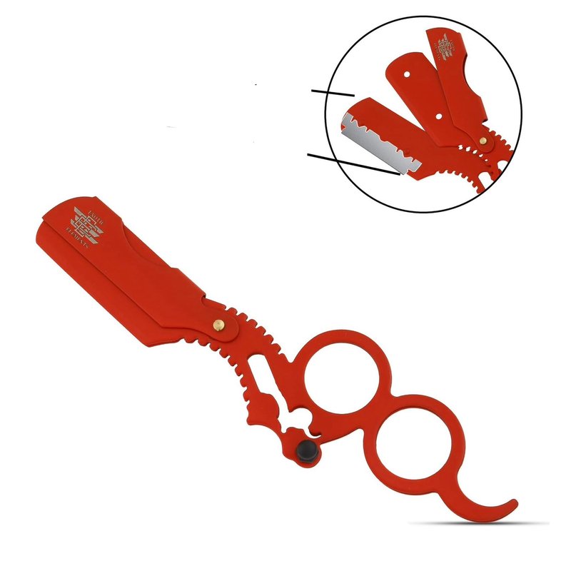 Red Engraved Razor Folding Straight Edge Unique Design Lightweight Easy to Use 2 Finger Inserts - Barber Quality
