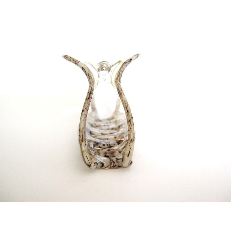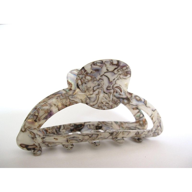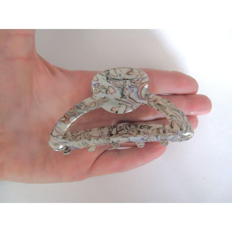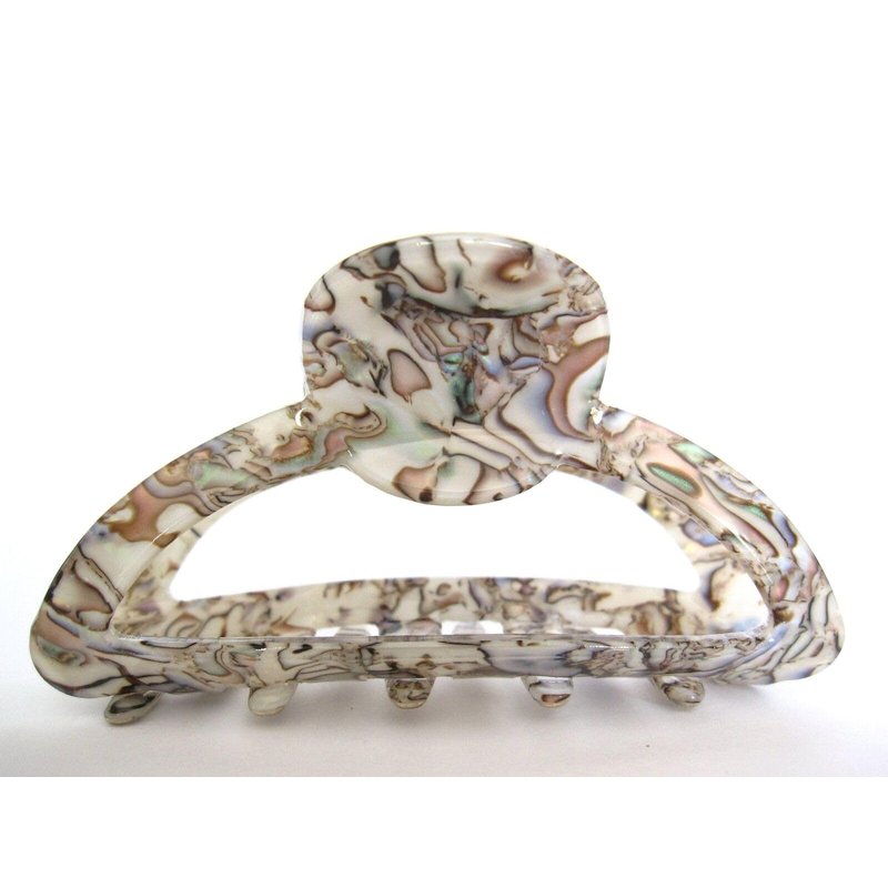 This hair claw has a rounded shape and the look of abalone sea shell.