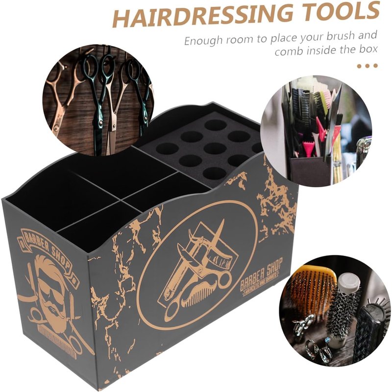 Package List 1 x holder box Features -Material:Abs,pp,sponge hair salon supplies -Color:Black hairstyling tool storage box -Note:Random style hairdressing comb storage box -Size:16.30X11.50X10.50cm/6.41X4.52X4 hairdressing scissors organizer. -Can protect and store your scissors, comb and other hairdressing tools. Multi-functional use hairdressing tool storage box. -With a wide range of uses and can be used in home storage, hair salons and barber shops hairstyling scissor holder. -Made of durable material, safe and practical, with excellent texture. Unique and eye-catching barber tools organizer. -The open storage rack is reasonable in design, lightweight and durable, convenient and practical salon scissor holder. -An efficient and practical storage box can keep everything organized, looking neat and very clean haircut scissor rack. Goods Information Barber Scissors & Supplies Organizer for Hairdressers It is designed to help you better store and organize your tools and provide you with a cleaner and more comfortable environment.barber tools organizer This storage box is suitable for various professional hairdressing tools such as hair clippers and combs.