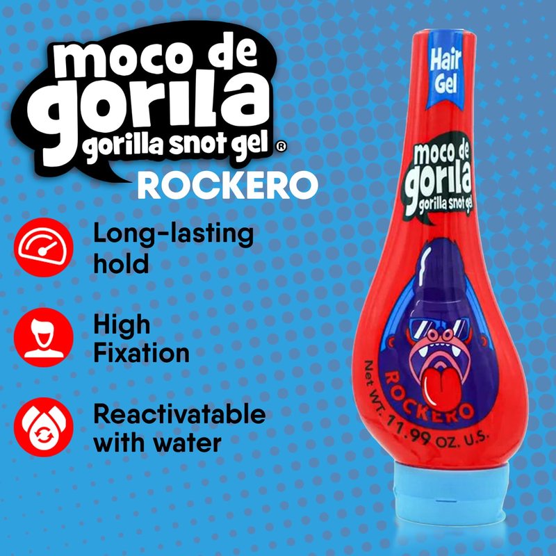 Get ready to rock with Moco de Gorilla Rockero Hair Gel. This vibrant, high-performance hair gel is engineered for those who want to channel their inner rockstar. With an 11.99 oz. bottle that promises to hold your spikes and waves through every headbang and riff, Moco de Gorilla Rockero is the ultimate accessory for every performance, rehearsal, or just a day out.