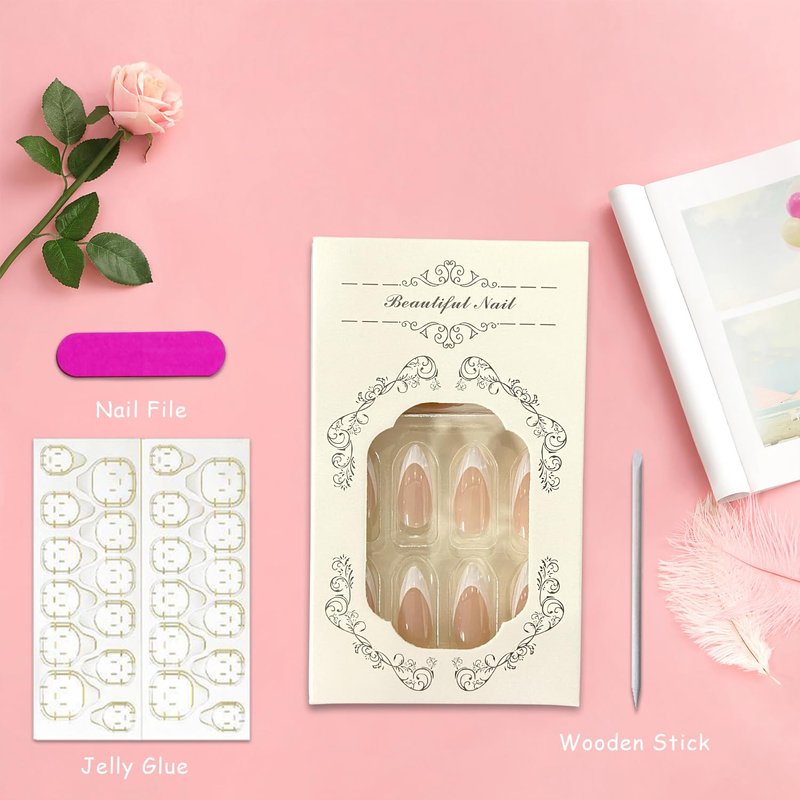 24 Pcs White French Nails Tip Design Press on Nails Long Almond Shape Fake Nails Set for Women Manicure Decorations