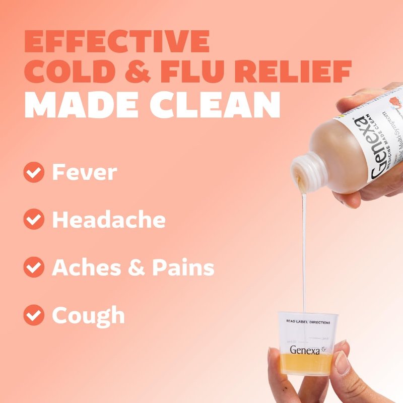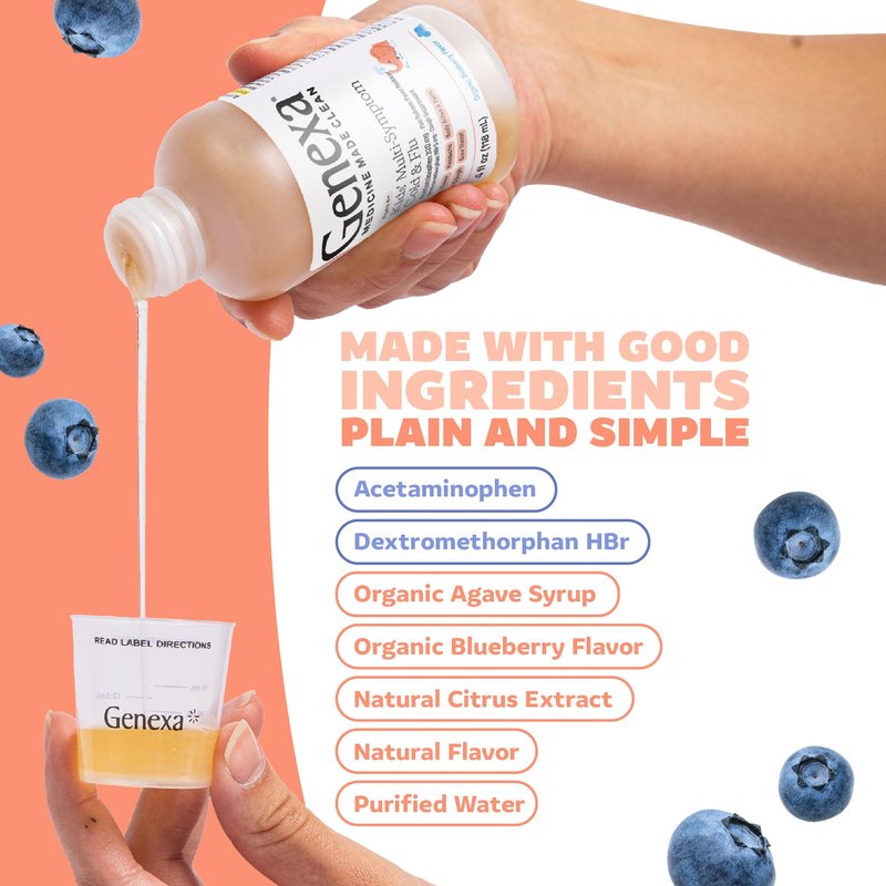 Genexa Kids' Multi-Symptom Cold & Flu is a multi-symptom medicine that helps relieve pain, fever, and cough to help your child feel better. This daytime oral suspension is made with proven active ingredients your child needs for symptom relief (320mg of acetaminophen and 5mg dextromethorphan HBr per 10mL) but without any artificial fillers - that means no artificial sweeteners, preservatives, and dyes, and no parabens, or any of the top 8 common allergens This oral suspension comes in a delicious organic blueberry flavor and is safe and effective when used as directed for children 4 years and older.
