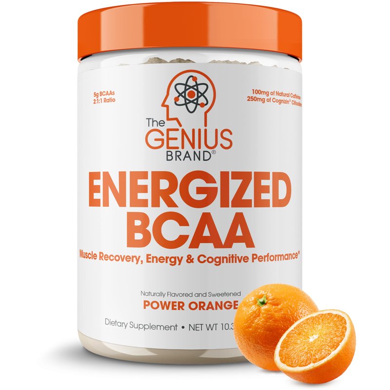 - Fuel Your Mind and Your Muscles: Upgrade your daily amino energy consumption and nourish both your brain and your physique with Genius BCAA by The Genius Brand.* Our BCAA supplement for men and women is vegan and boosted with 100 mg of natural caffeine. Made in the USA without artificial colors, dyes, flavors, or sweeteners. Power Orange flavor. 21 servings per container.