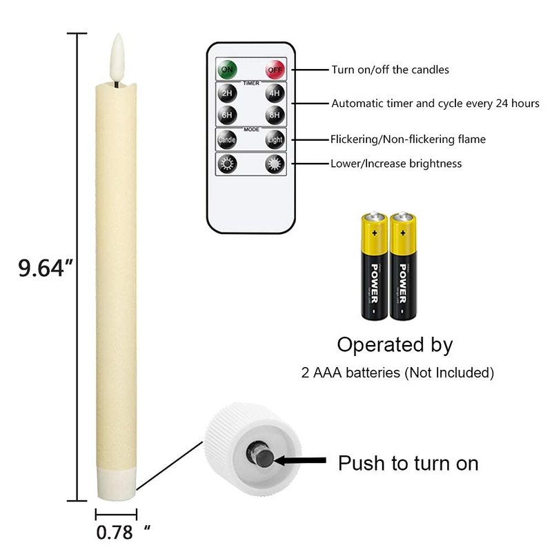- A COMPLETE SET OF FLAMELESS TAPER CANDLES: This value pack comes with 6 beautiful flickering flameless taper candles, one remote control with 10 different keys and a super easy to follow operating manual. Specifically, this set includes six flickering flameless taper candles(9.64 inch high x 0.78 inch diameter). Each candle operated by 2 AAA batteries(not include).