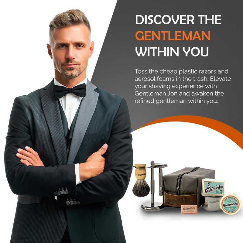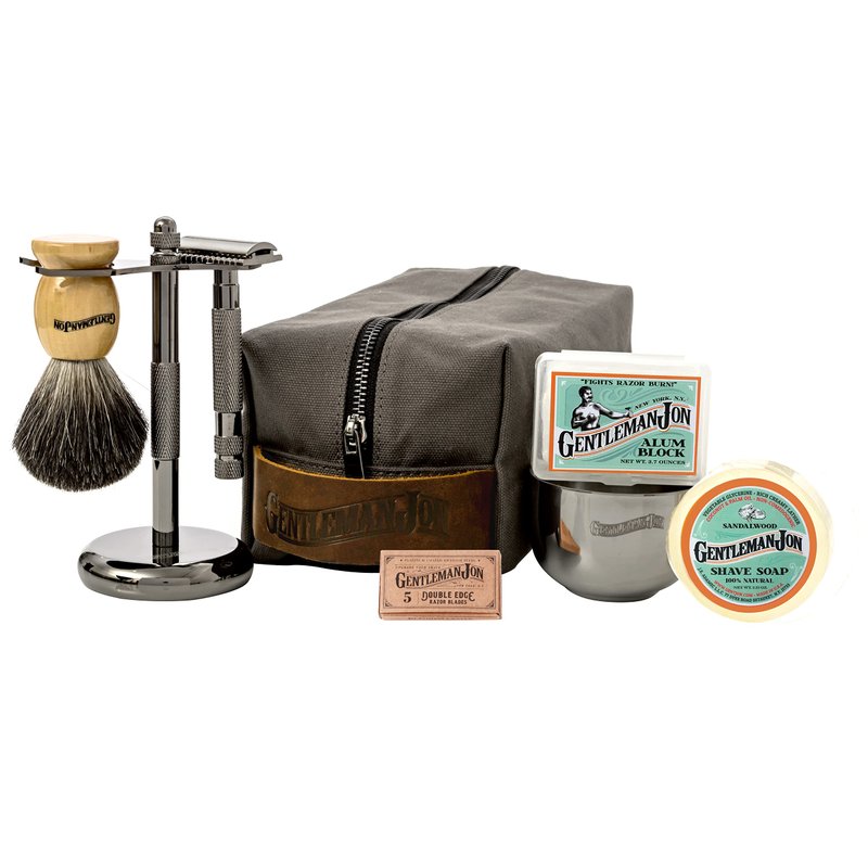 - COMPLETE MEN'S SHAVING KIT: The Gentleman Jon Shaving Kit for Men is a comprehensive set that includes a safety razor, badger hair brush, alum block, shave soap, stainless steel bowl, shaving stand, canvas & leather dopp kit, and five razor blades - everything needed for a luxurious, comfortable and smooth wet shave experience. With its compact design, our product is also a suitable travel companion to those who value traditional shaving, ensuring a neat shave even while on the go.