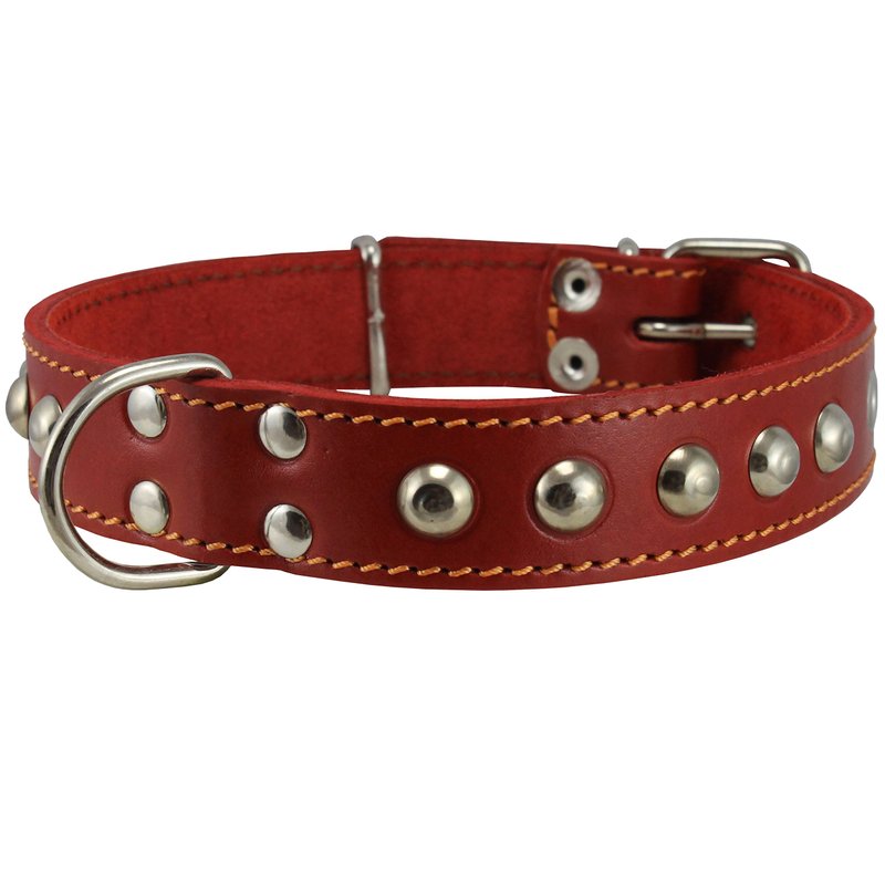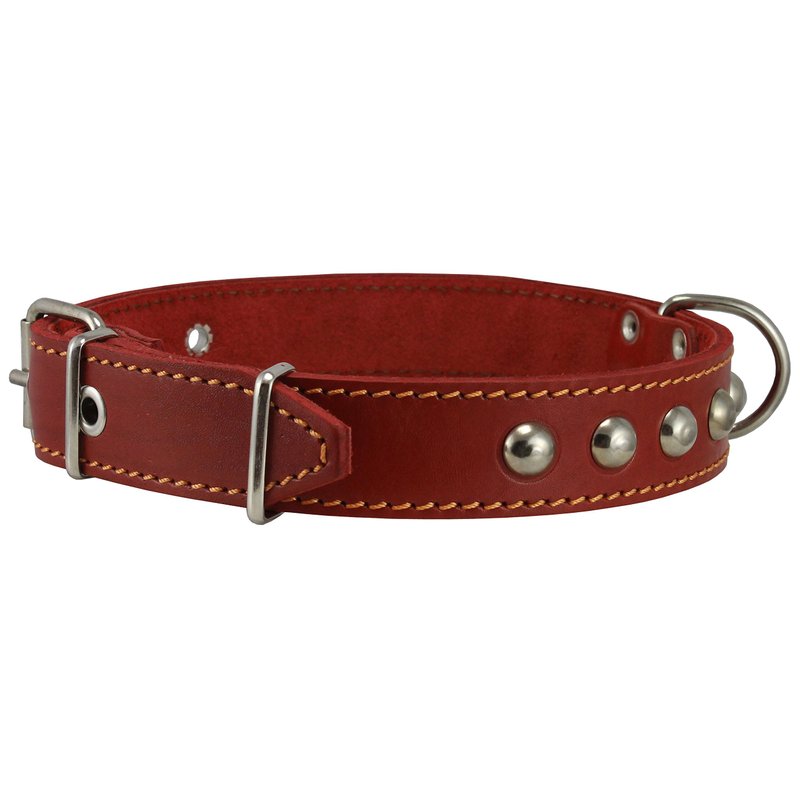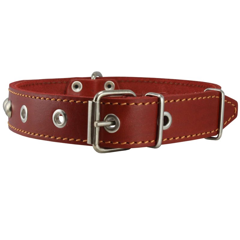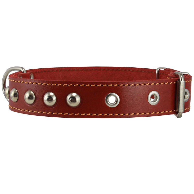 This beautiful 1" wide studded collar is made of quality genuine leather. It features metal enforced eyelets and nickel-plated hardware. This size will fit 14"-17" neck - please measure your dog neck for fit before you place the order.