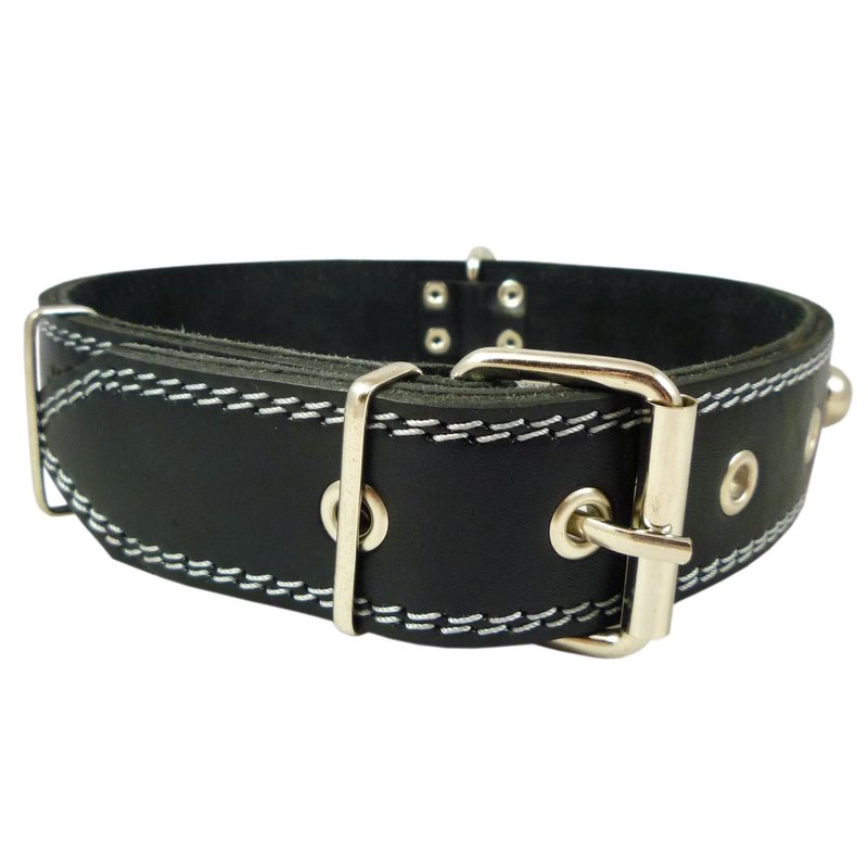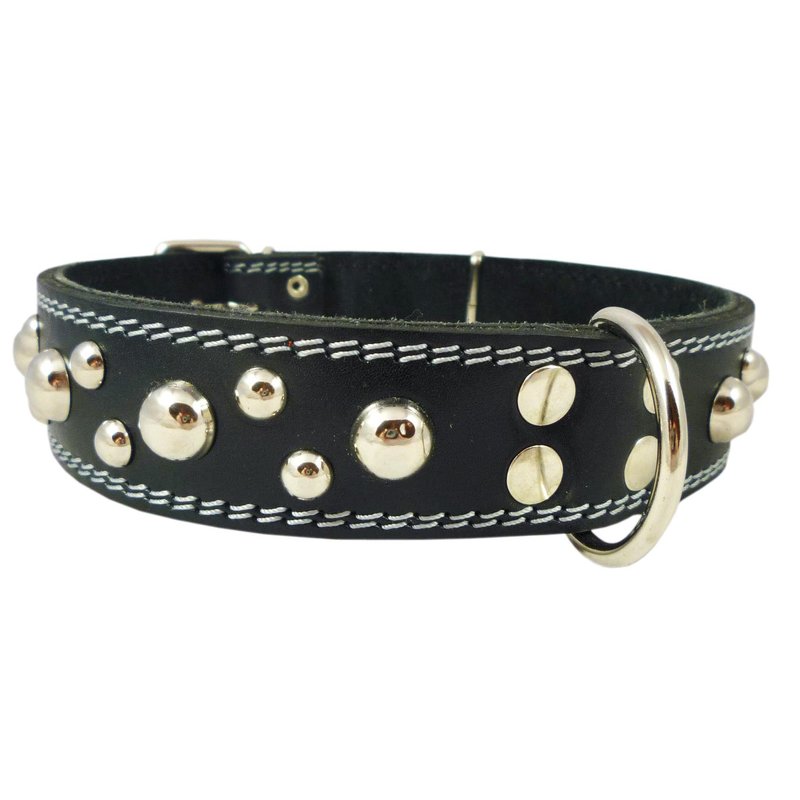This high quality beautiful 1.6" wide studded collar is made of quality double ply genuine leather. Features metal enforced eyelets and nickel-plated hardware. This size will fit 19"-23" neck - please measure your dog neck for fit before you place the order.