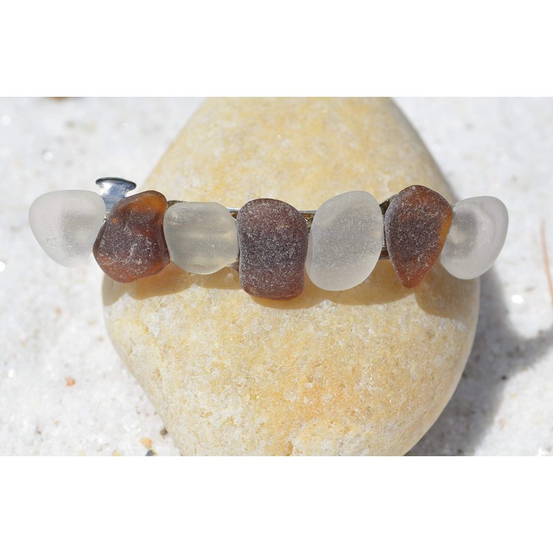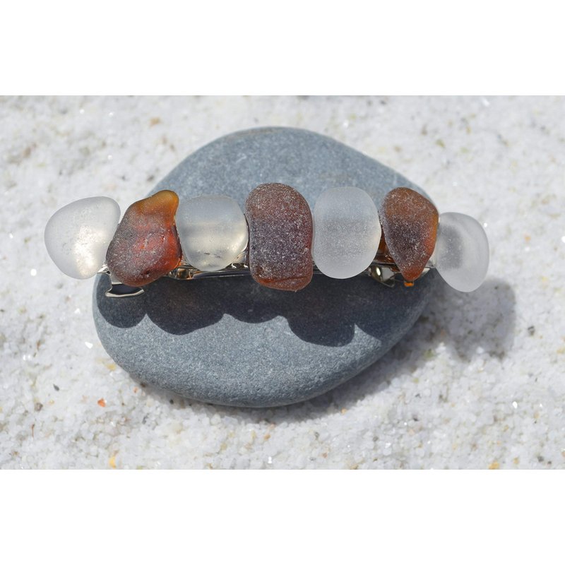 Genuine surf tumbled amber brown and frosted white sea glass French barrette. The brown and frosted white beach sea glass adorns a silver metal French barrette. The French barrette is perfect for frolicking in the surf, for a day out at the beach or for a tropical vacation. The sea glass is authentic frosted brown and white beach sea glass. The French hair barrette is handmade; each piece of sea glass was carefully selected for its color to create a stunning design in a brilliant shade of browns and frosted sea glass. The surf tumbled sea glass is genuine and was collected on the rocky shores and sandy beaches of coastal Maine. The sea glass has a lovely natural frosted surface as a result of the glass being tossed about the waves and ocean shores for a number of years. The sea glass French barrette is made in the USA and from a smoke free environment. The sea glass French barrette measures: 61 mm x 16 mm x 15 mm or 2.4 inches x .6 inches x .57 inches
