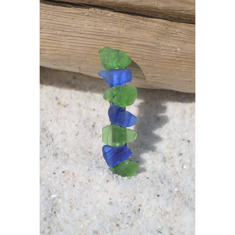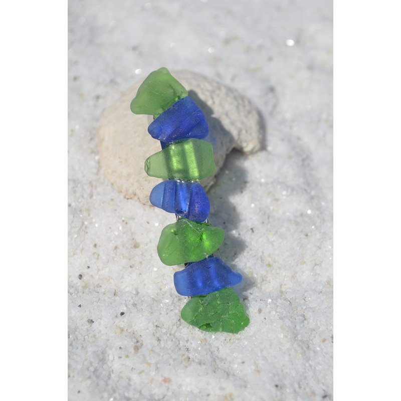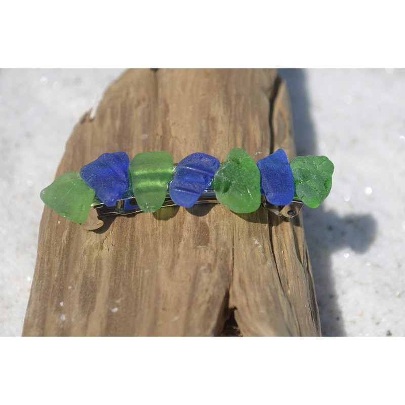 Genuine frosted cobalt blue and kelly green sea glass French barrette. The blue and green beach sea glass adorns a silver metal French barrette. The French barrette is perfect for frolicking in the surf, for a day out at the beach or for a tropical vacation. The sea glass is authentic frosted blue beach sea glass. The French hair barrette is handmade; each piece of sea glass was carefully selected for its color to create a stunning design in a brilliant shade of frosted blues. The sea glass is genuine and was collected on the rocky shores and sandy beaches of coastal Maine. The sea glass has a lovely natural frosted surface as a result of the glass being tossed about the waves and ocean shores for a number of years. The sea glass French barrette is made in the USA and from a smoke free environment. The sea glass French barrette measures: 61 mm x 16 mm x 15 mm or 2.4 inches x .6 inches x .57 inches.