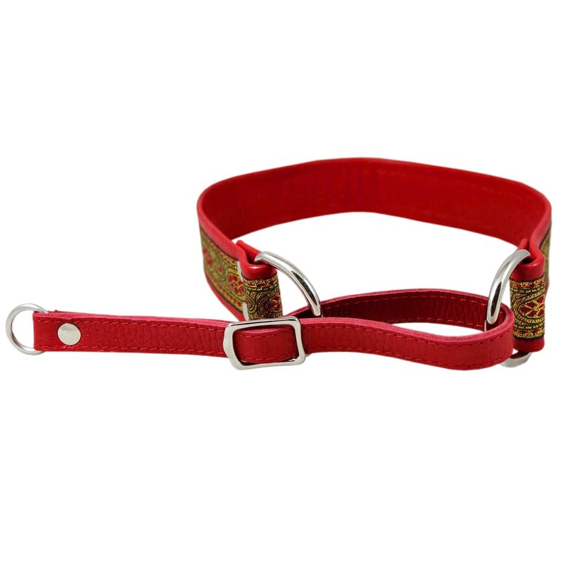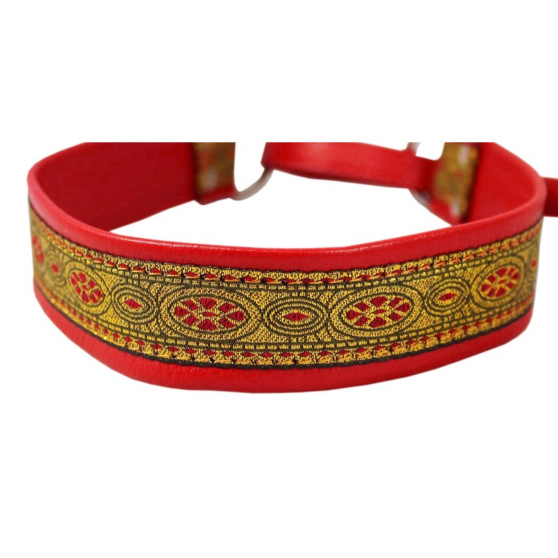 This fabulous martingale collar is made of two layers of high quality genuine leather with beautiful pattern jacquard ribbon stitched on. This collar is sized to fit a 20.5 to 24 inch neck.