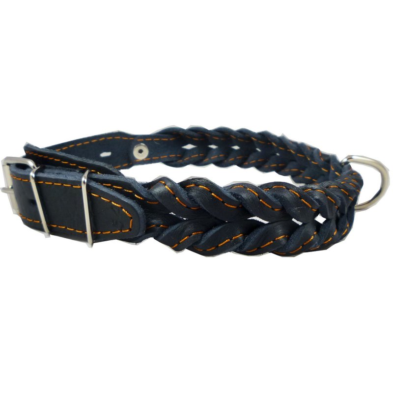 A premium quality braided collar made of soft 100% genuine leather with nickel plated hardware. Thick waxed thread stitching adds extra durability while making the braid stand out.