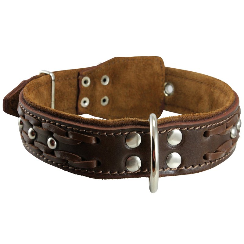 Genuine Leather Braided Studded Dog Collar, Soft Suede Padded Brown 1.5" Wide. Fits 17"-21" Neck.