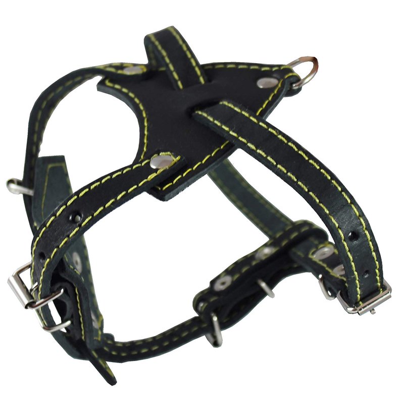 Made of 1/2" wide genuine leather. Strong and comfortable, wide chest piece designed to equally distribute tension. Trimmed with thick contrast color waxed thread. Best choice for daily walks and training. This size is recommended for Medium breeds, sized to fit 16.5-20 inches chest circumference.
