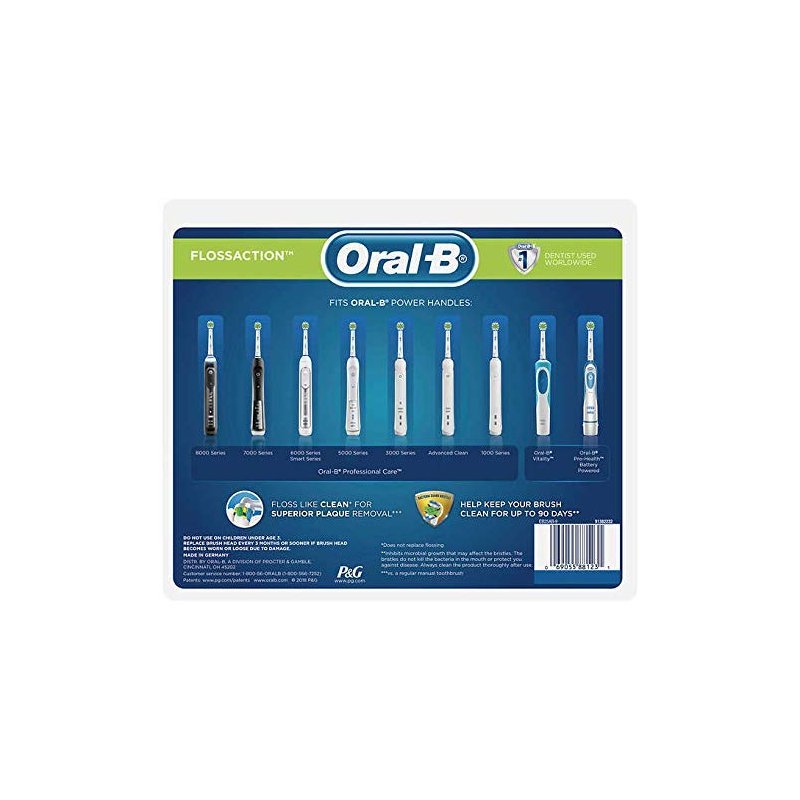 The Oral-B Floss Action Replacement toothbrush head provides a floss-like clean*. The round brush head is inspired by dental professional tools for a tooth-by-tooth clean, with specially engineered bristles for optimal tooth coverage. The Floss Action toothbrush head has unique floss action bristles to loosen plaque. *on a Oral-B Pro 2000 or higher, does not replace flossing. Compatible with Oral-B Genius 8000, Oral-B PRO 7000, 6000, 5000, 3000 and 1000, and Oral-B Vitality