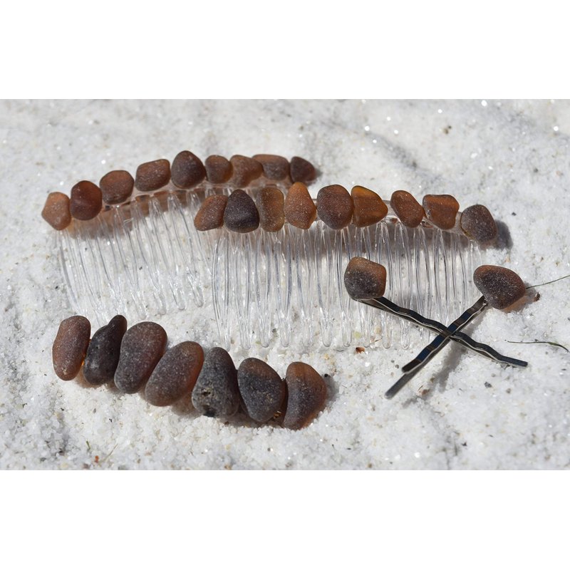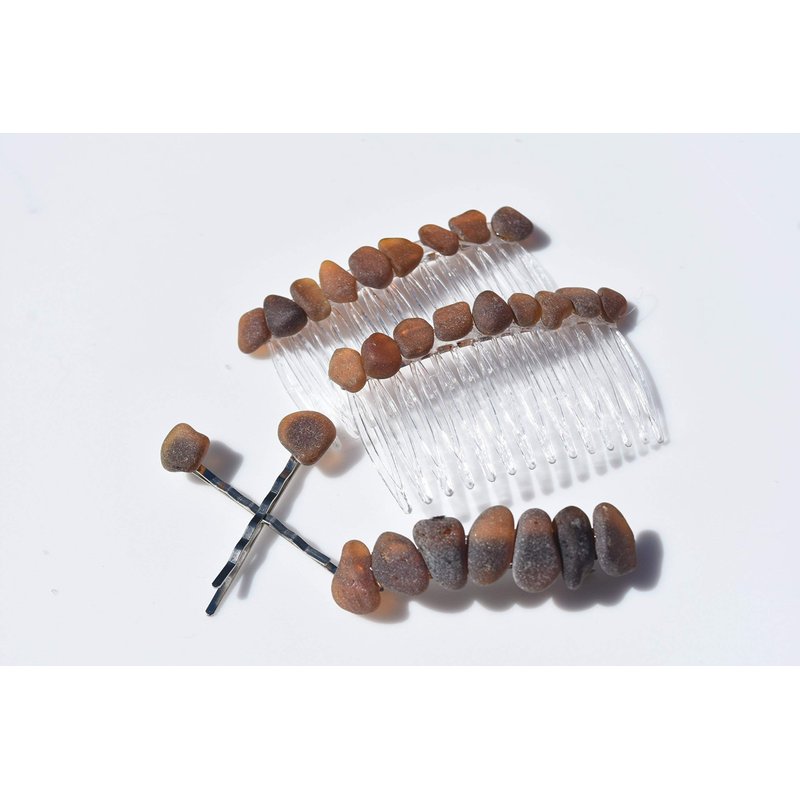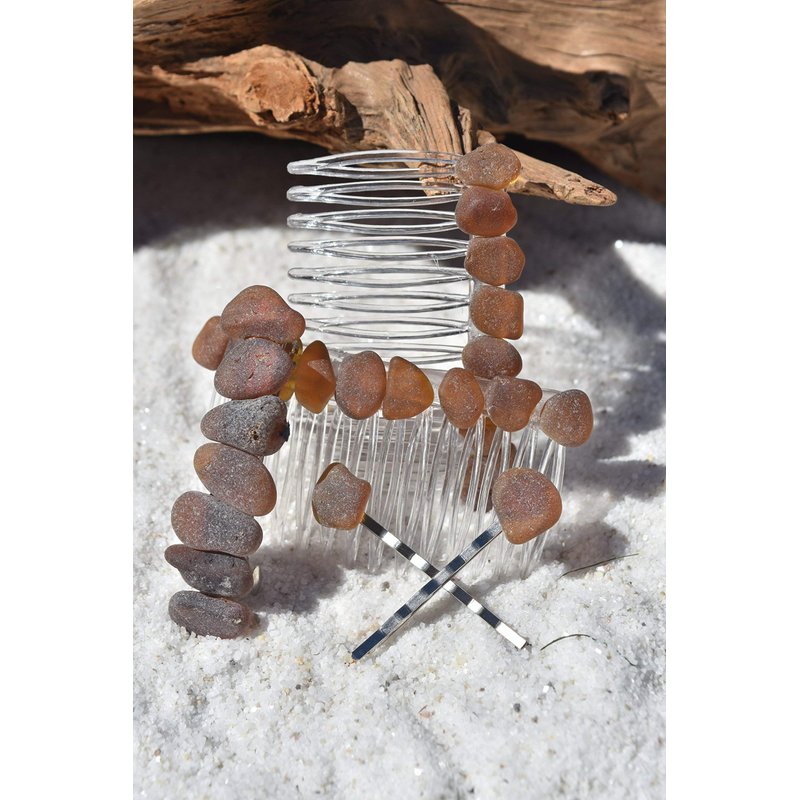 Genuine frosted brown glass in varying shades adorn a beautiful set of hair jewelry. The matching set includes: a pair of hair combs, a french barrette, and two hair pins. The natural surf-tumbled beach sea glass adorns a silver metal French barrette, a set of acrylic hair combs, and two metal bobby pins,. The matching set of hair jewelry is perfect for frolicking in the surf, for a day out at the beach, a special day like a wedding or for a tropical vacation. The sea glass is authentic sea glass. The hair jewelry is handmade; each piece of sea glass was carefully selected for its color to create a stunning design in a brilliant colors. The sea glass is genuine and was collected on the rocky shores and sandy beaches of coastal Maine. The sea glass has a lovely natural frosted surface as a result of the glass being tossed about the waves and ocean shores for a number of years. The sea glass is made in the USA and from a smoke free environment. The set includes: 2 - Hair Combs 1 - 60 mm French Barrette 2 - Hair Pins