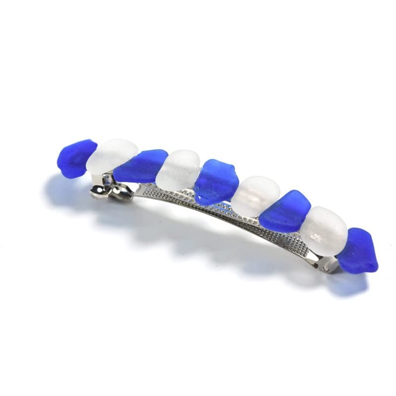 Genuine Surf Tumbled Frosted White and Blue Sea Glass French Barrette Hair Clip 4" or 100 mm Length - Quantity of 1