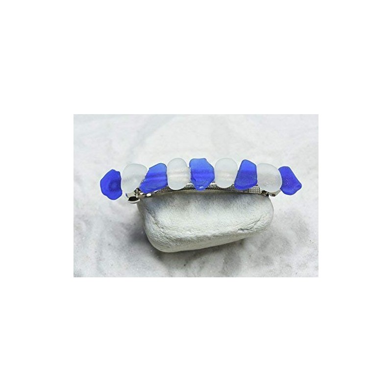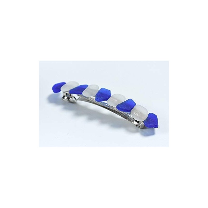Genuine frosted white and blue sea glass adorns this 4" French barrette. The natural surf-tumbled frosted blue and white beach sea glass adorns a silver metal French barrette. The French barrette is perfect for frolicking in the surf, for a day out at the beach, a special day like a wedding or for a tropical vacation. The sea glass is authentic frosted sea glass. The French hair barrette is handmade; each piece of sea glass was carefully selected for its color to create a stunning design in a brilliant shades of the ocean. The sea glass is genuine and was collected on the rocky shores and sandy beaches of coastal Maine. The sea glass has a lovely natural frosted surface as a result of the glass being tossed about the waves and ocean shores for a number of years. The sea glass French barrette is made in the USA and from a smoke free environment. The sea glass French barrette measures: 100 mm x 30 mm x 40 mm or 4 inches x .65 inches x .75 inches.