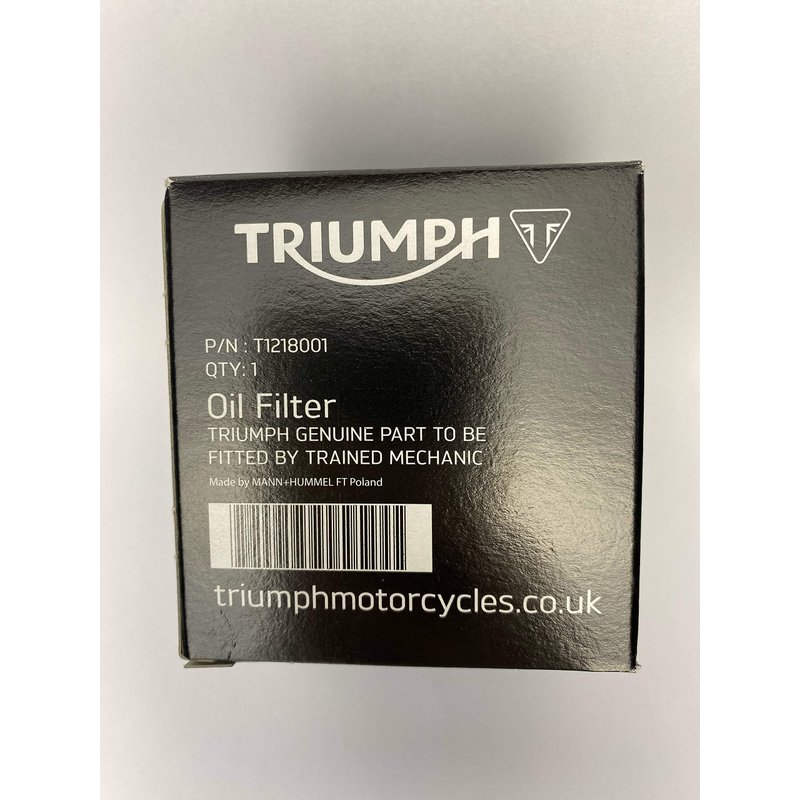 Genuine Triumph Oil Filter and Sump Plug Washer This kit fits most modern Hinkley Triumph Motorcycles Genuine Triumph oil filter and sump washer- T1218001/T3558989 The Spin On Oil Filter fits the following models: America, Bobber, Bobber Black, Bonneville, Bonneville SE, Bonneville T100/900cc, Bonneville T120/Black, Bonneville Speedmaster, Daytona 595, Daytona 955i, Daytona 600, Daytona 650, Daytona 675, Daytona 675R, Rocket III, Scrambler, Scrambler 1200, Speed Four, Speed Twin, Speed Triple from VIN 210445 and up, Speed Triple R, Speedmaster, Sprint GT, Sprint RS, Sprint ST, Street Triple, Street Triple R, Street Triple 765, Street Twin, Street Cup, Street Scrambler, Thruxton, Thruxton 1200, Thruxton R, Tiger 1050, Tiger 885i from VIN 71699 to 124105, Tiger 955i from VIN 124106 and up, Tiger Sport, Tiger 800, Tiger 800 XC, Tiger 1200, Tiger Explorer, Tiger Explorer XC, Tiger Explorer SE, Trophy 1215, Trophy 1215 SE, TT600.
