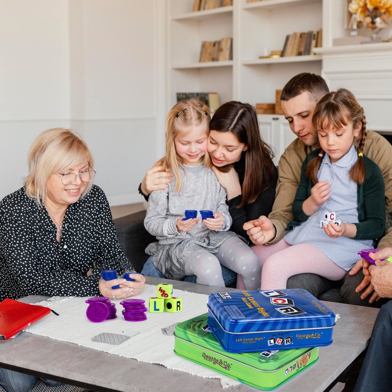 - Left, Center or Right in Blue Tin - don't lose your chips! Play with chips or whatever makes it fun for you. The exciting game that everyone's getting hooked on. For 3 or more players, ages 5 and up.