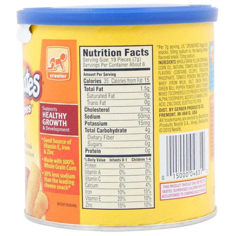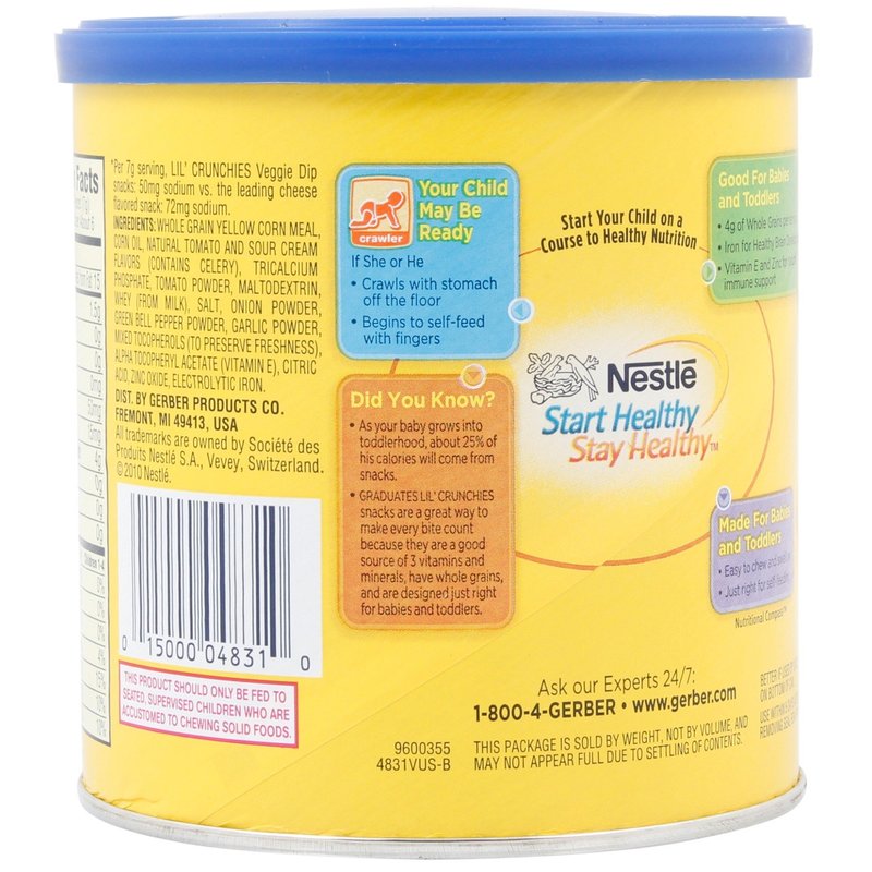Gerber Snacks for Baby Lil’ Crunchies, Veggie Dip, Non-GMO Baked Grain Snack with No Artificial Flavors, Made for Crawlers 8+ Months, 1.48-Ounce Canister: Gerber Lil’ Crunchies Snacks are made with whole grain sorghum just for your little one. Made to Love: Gerber Lil' Crunchies snacks are easy-to-dissolve and crafted for little one to explore new textures. And they're always made non-GMO and without any artificial sweeteners, flavors, or synthetic colors for baby. Keep it Wholesome: We grab every opportunity to give baby the nutrition they need. That's why even our Lil' Crunchies snacks are made with the goodness of 2 grams of whole grains per serving, 15% daily value of iron, and 20% daily value of Vitamin E. Made for Lil’ Ones: As your crawler (8+ months) continues to self-feed, give 'em snacks that are perfectly designed for tiny hands. The meltable texture is easy to chew & swallow, making it the perfect snack for baby! Your baby may be ready for Lil’ Crunchies if they: Crawl without tummy on the floor; Start using fingers to eat; Start using jaw to mash food.