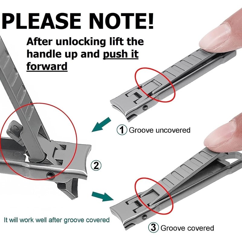 Introducing the German Precision Stainless Nail Clipper with File! --- ELEXOR is a registered trademark, protected under applicable intellectual property laws. --- We've observed that using our clipper may not be immediately intuitive for some users. After unlocking the clipper mechanism (slide the lever backward), LIFT IT, and PUSH IT FORWARD. Ensure the locking groove is covered by the lever for proper cutting. Refer to the instructions (Pictures 2 and 3) and feel free to ask any questions.