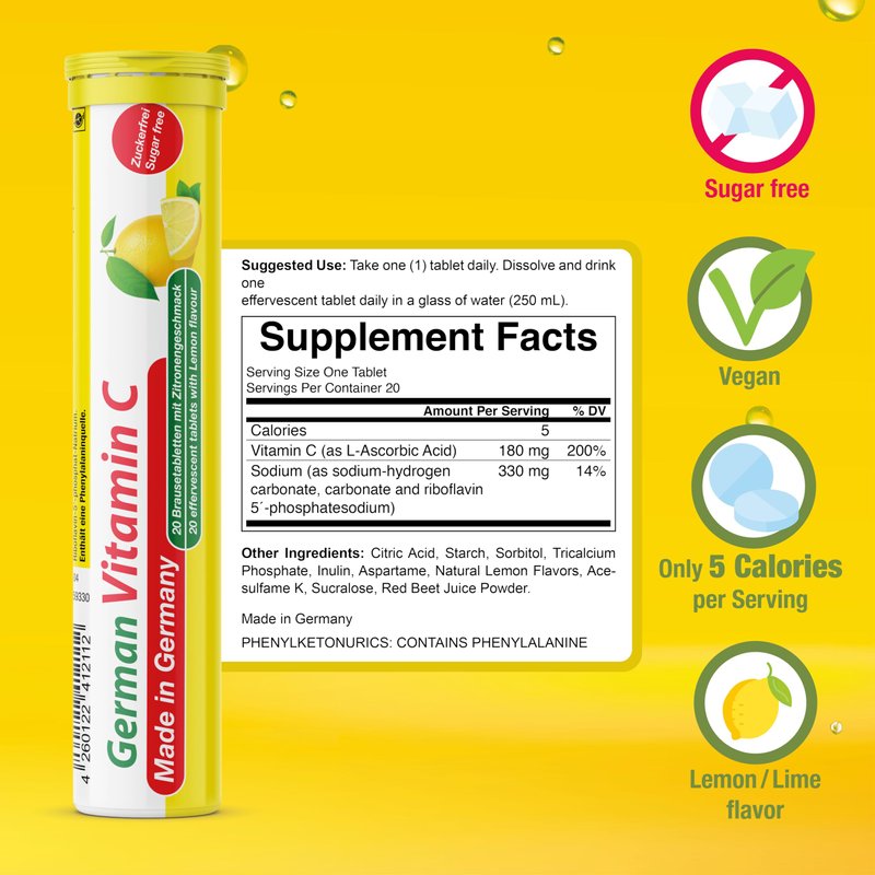 German Vitamin C 180 mg - 40 Vegan Drink Effervescent Tablets - Lemon Lime Flavor - Made in Germany