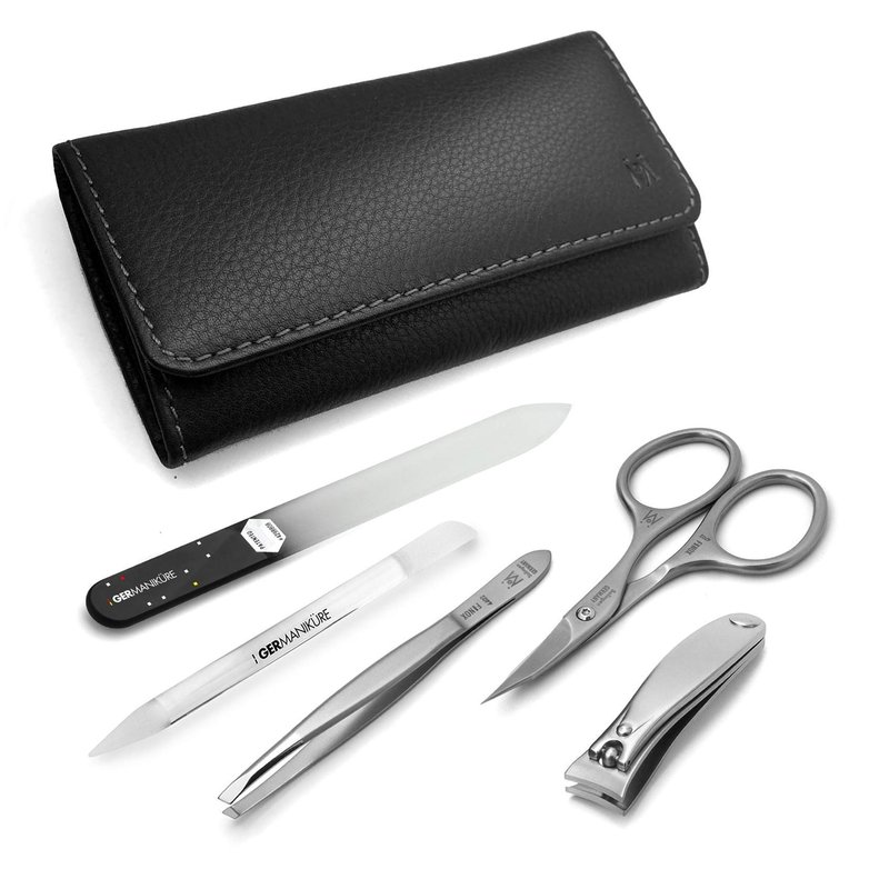 GERMANIKURE 5pc Manicure Set - Handmade in Solingen Germany, FINOX Stainless Steel: Nail Clipper, Combination Scissor, Slanted Tweezer, Czech Glass Nail file and Cuticle Stick in Leather Case