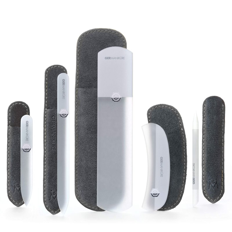 GERMANIKURE Gray Glass Nail File Set in Suede Cases – Handmade in Czech Republic – Professional Manicure & Pedicure Supplies – Glass Cuticle Stick, Pusher, Callous Remover