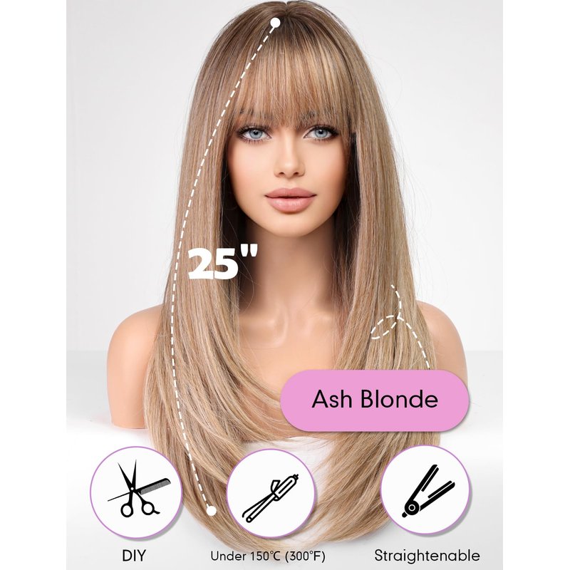 Getshow Blonde Wigs for Women Layered Straight Long Wig with Bangs Natural Synthetic Hair with Dark Roots