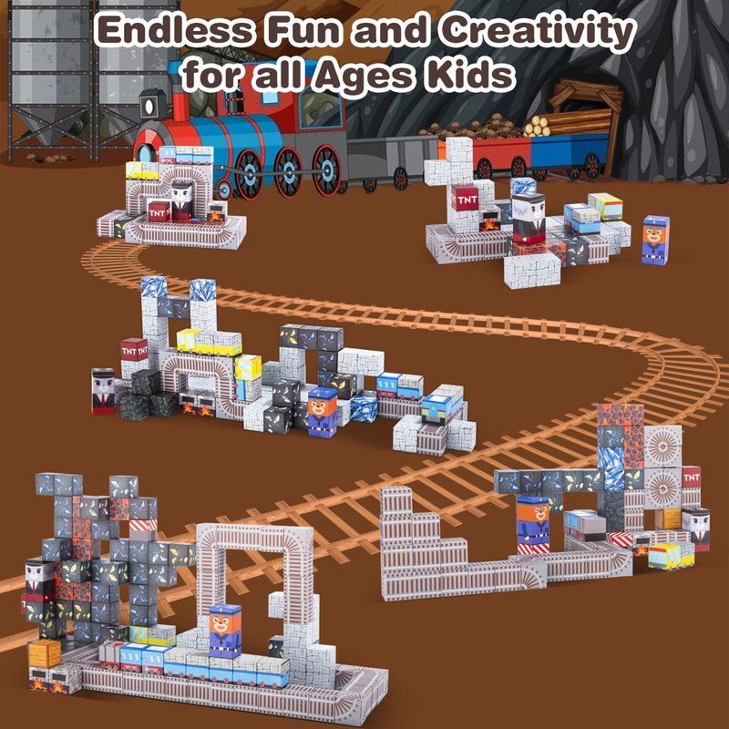 - Begin on a Train Track Adventure - Dive into endless fun with this magnetic blocks! This 80pcs magnetic building cubes include tracks, lava, trucks, sparkling gems, rare ores, bedrock, etc. Kids can create intricate routes with straight paths and multi-directional curves. Fun characters like the Rabbit Conductor and Bear Officer are ready to join them on a mining adventure filled with discovery and creativity.