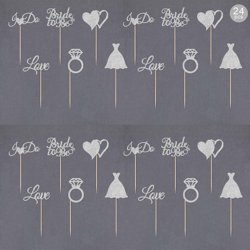Gexolenu 24 Pcs Bride To Be Cupcake Toppers Silver Glitter Double-Sided I Do Love Heart Diamond Ring Cupcake Picks Decorations For Bridal Shower Wedding Engagement Party Supplies