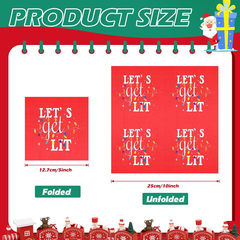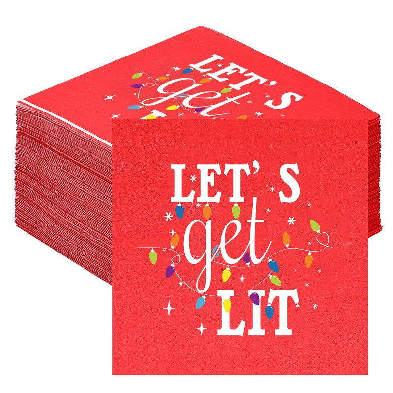 Features: Holiday-Theme Features: With the Christmas-themed design and snowflakes and the words "let's get lit", our cocktail napkins infuse a warm, festive feel to your gatherings. Their rich holiday atmosphere makes them for your Christmas celebrations. Lightweight and Portable: Thanks to their paper construction, these cocktail napkins are light, easy to carry, and can be conveniently stored. Whether you're hosting a party at home or at a different location, our napkins are the go-to choice for your needs. Specifications: Material: paperColor: redSize: 5 x 5 inchesStyle: let's get litFeatures: Bright colors, sufficient quantity, easy to carry and store, light weight, safe, 2-layer design, reliable and soft, Christmas theme, printed with snowflakes and the words "let's get lit", rich holiday atmosphere, exquisite patternPackage includes: 100 pcs Cocktail NapkinsNotes: Manual measurement, please allow slight errors on size. The color may exist a slight difference due to different screen displays.