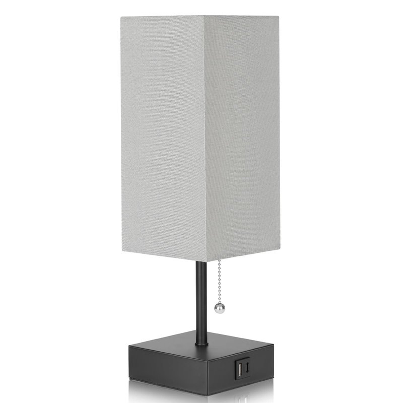 GGOYING Bedside Table Lamp, Modern Nightstand Lamp with USB Charging Ports, Pull Chain, 2700K LED Bulb, Grey Fabric Shade for End Table Living Room Home Office Study Room