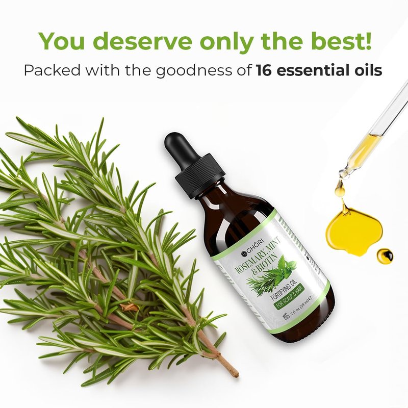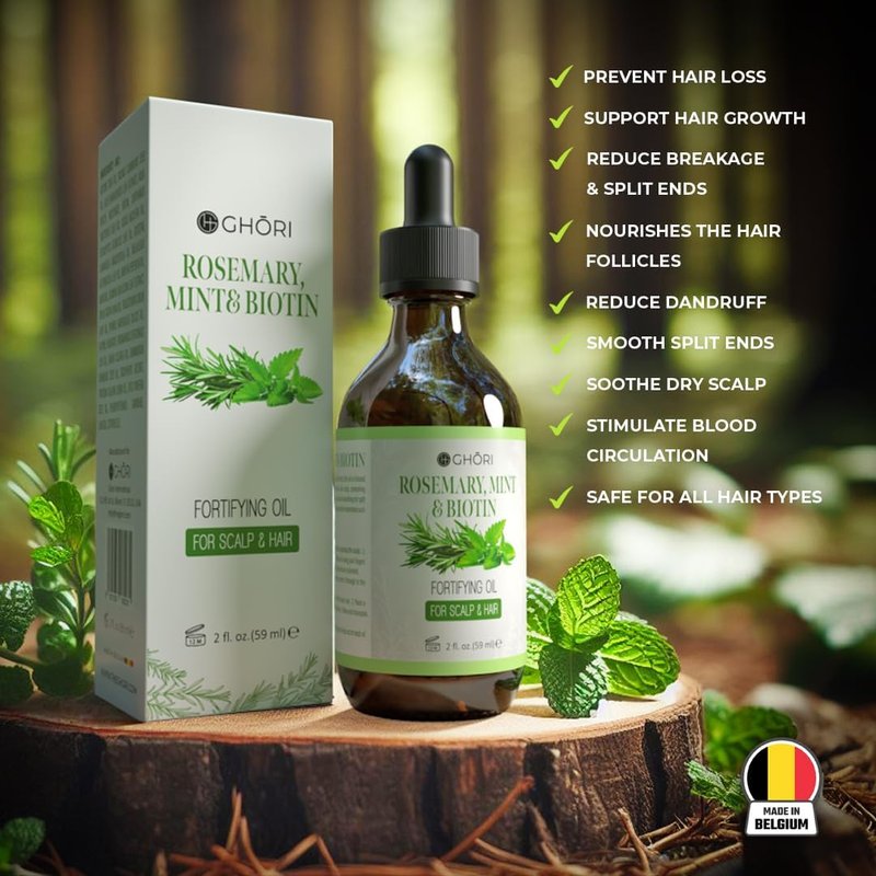 - Benefit - Infused with the invigorating scent of rosemary and mint, Ghori's Rosemary Mint and Biotin hair oil not only promotes hair vitality but also provides a refreshing, aromatic experience during each application. Experience the sensory pleasure while giving your hair the nutrients it needs for a lush, vibrant appearance.