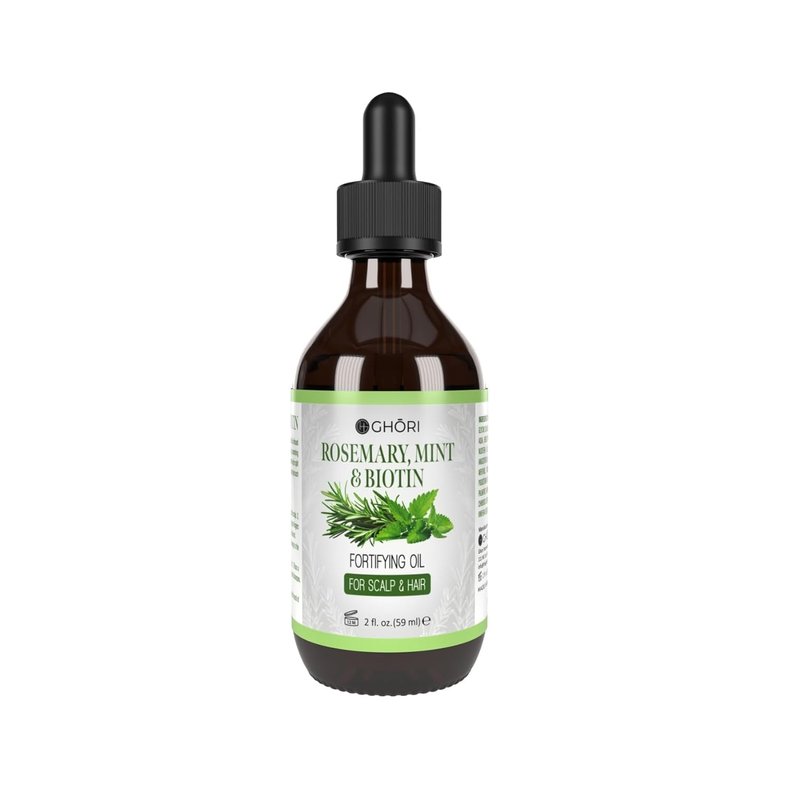 - Ghori Rosemary, Mint & Biotin Oil is a unique formula for hair contains natural ingredients known to promote strong hair. The key ingredients in this oil are Rosemary and Mint, which work together to stimulate blood circulation to the scalp and improve the overall health of your hair.