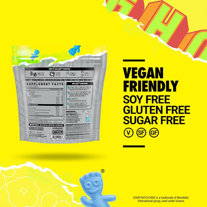 - Stay Hydrated: GHOST Hydration can be used anytime to elevate your water or replace sugary sports drinks. Grab a bottle of water (or your favorite GHOST shaker), toss in a stick of GHOST Hydration, and enjoy some seriously epic-tasting, electrolyte-enhanced H2O while you hit the gym, the field, the ice, or even the office on a Monday. Sour Patch Kids Blue Raspberry flavor. 1 stick per serving, 24 servings per container.