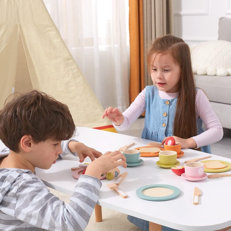 - 27 PIECES, SERVING 4 - the wooden dinnerware set for toddlers comes with total 27 pieces,intend to serve 4,including plates, knifes, forks, spons, salt, piper,cups and saucers so kids can host a pretend dinner party. With a storage bag, knifes, forks and spoons can be easily preserved.