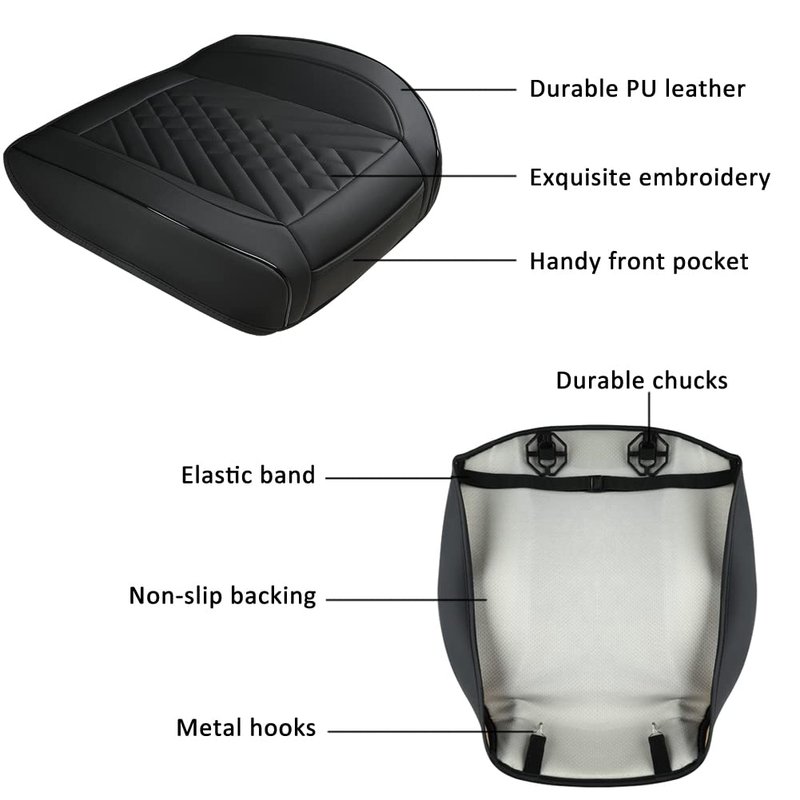 - STAYS IN PLACE - Non-slip silicone backing and durable accessories will keep the seat cover stay in place, without damaging the original seat. Please don't worry about the seat cover sliding in and out of the seat.
