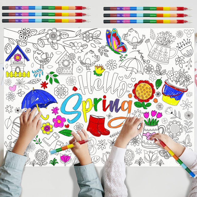 - Giant Coloring Poster Set: Package includes 1 large hello spring paper coloring poster and 6 pcs (12 Colors) Stacking Crayons. The simple coloring designs provide the kids with the enjoyment of drawing without ink, which keeps mess away and is safe for the human body! because the product is packaged after being folded, there are some creases, but it does not affect the use