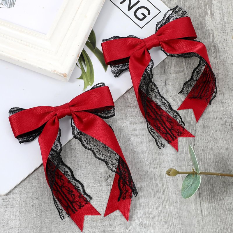 Giantree 2 Pcs Red Lace Hair Bow Clips for Women, Cute Lace Hair Bows Clips with Long Tail Ribbon for Wedding Halloween Gothic Dress Decor Accessories Gift