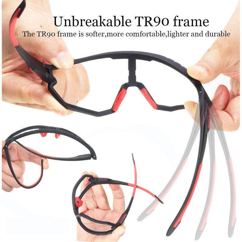 Cycling sunglasses use TR90 frame, which is lightweight, flexible and impact resistant. Soft rubber nose pads can reduce the pressure on the nose.