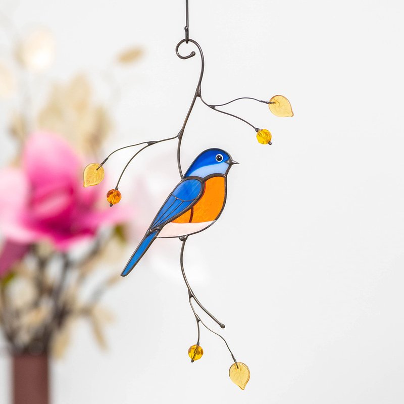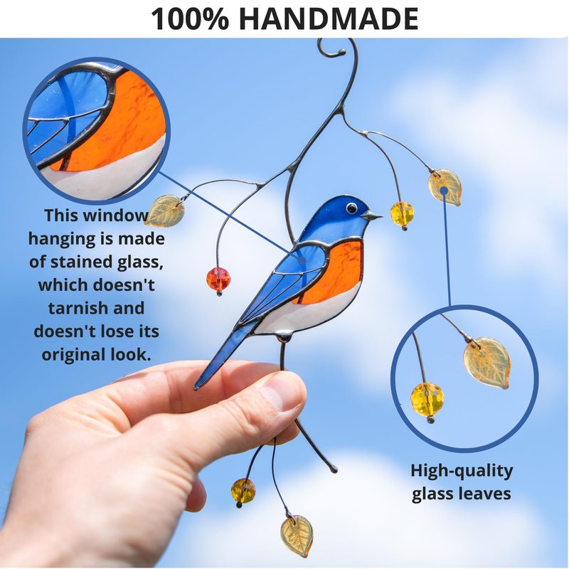 About suncatcher: This stained glass Bluebird suncatcher is so beautiful that it's hard to look away. Moreover, bluebirds are frequently seen as symbols of happiness, joy, and good fortune. The vibrant blue plumage of these birds is often associated with positive emotions and a sense of well-being.So, becoming the owner of this bird, you can fill your home with a positive atmosphere or gift it to someone special!