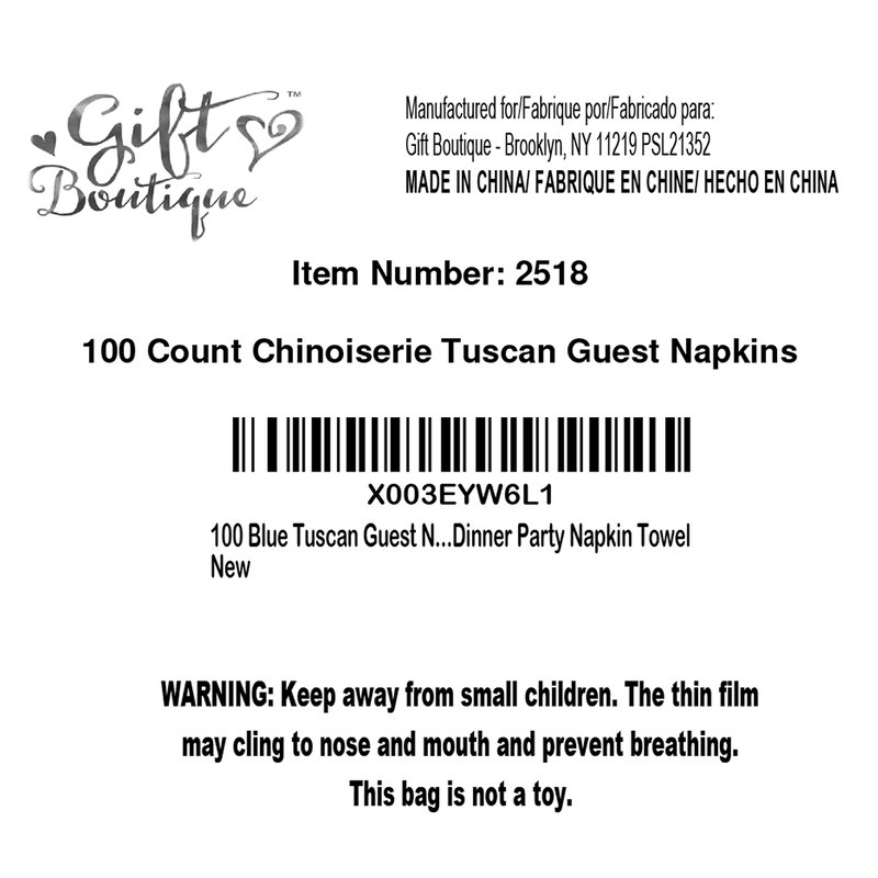Tuscan Guest Napkins: Gift Boutique set of 100 Tuscan guest napkins features blue Pagoda with flowers design on a white background! These napkins will definitely enhance your table and impress your guests. Measurements: 7.5" x 4.25" folded and 15" x 12.75" unfolded. For Gatherings & Special Events: Perfect for 50th anniversaries, birthday parties, tea gatherings, and wine tasting. Flawless napkins for wedding receptions, engagement and graduation parties, fancy restaurants, holidays, hearty lunch and more! Treat your guests with all the attention they truly deserve! High Quality: Napkins are made of high quality thick paper. Napkins are soft and absorbent & dry your hands quickly. These napkins will be great for any Tuscan themed party. The Tuscany party napkins really adds dimension to your parties as your guests will love the cute and pretty design. Enough For Your Guests: Stock up with these blue and white napkins so you can be assured that you will have enough for all your guests who will attend your party. Serve dinner to guests in catering, buffet, potluck, events or daily meals. Ideal for dinner table placement, office, party decor, powder room, bathroom vanity, kitchen counter top and guest bathrooms. More Time To Enjoy: Disposable paper reduces clean-up time so you can enjoy more time with friends and family. After the party just collect the tablecloths with all the garbage and throw it into the trash can. Presto! Cleanup completed!