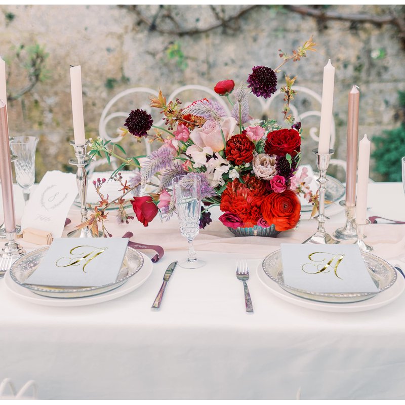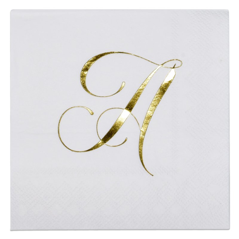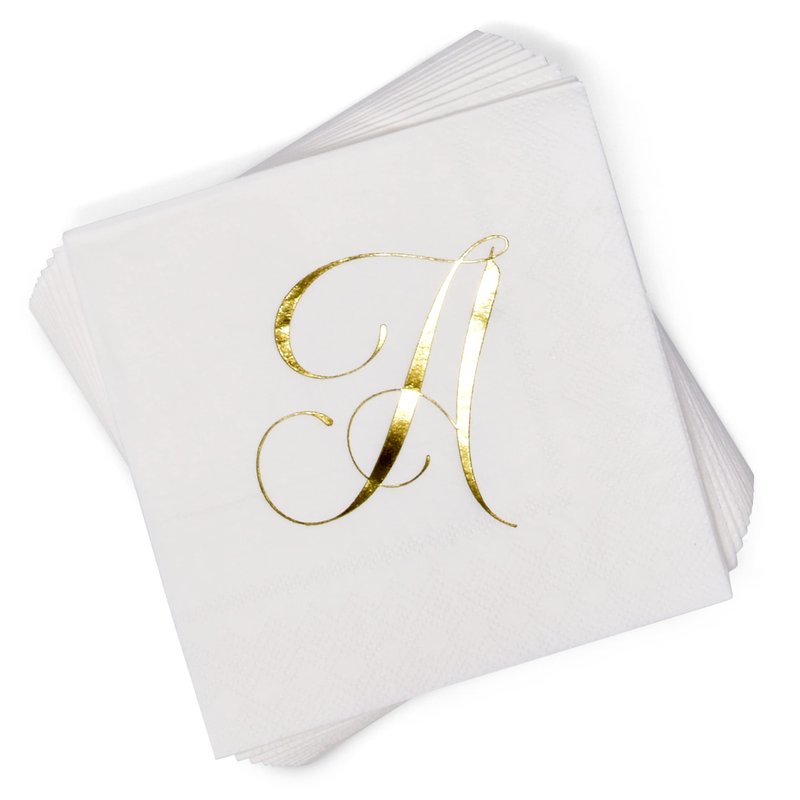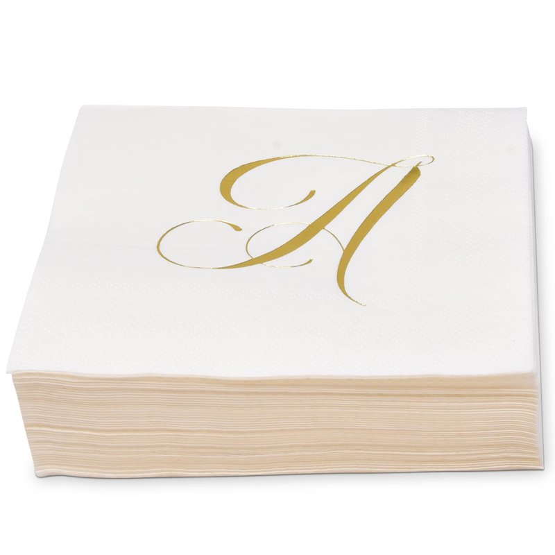- Monogrammed Cocktail Napkins Serve 100: Gift Boutique square monogram cocktail napkins features the letter A printed in gold foil on white. These napkins will definitely enhance your table and impress your guests. These are essential for providing guests high-end comfort and luxury. Measures:5" x 5" folded and 10" x 10" unfolded.