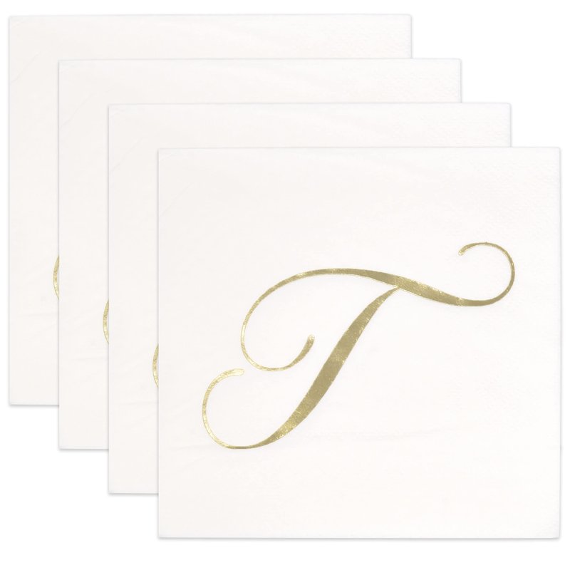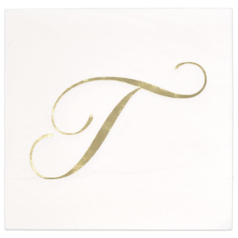- Monogrammed Cocktail Napkins Serve 100: Gift Boutique square monogram cocktail napkins features the letter T printed in gold foil on white. These napkins will definitely enhance your table and impress your guests. These are essential for providing guests high-end comfort and luxury. Measures: 5" x 5" folded and 10" x 10" unfolded.