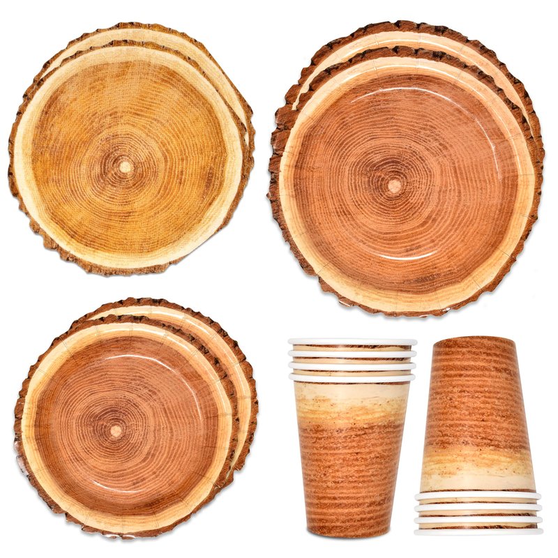 - Wood Slice Party Set Serves 24: Gift Boutique wood slice party set includes 24 9" dinner plates, 24 7" dessert plates, 24 luncheon napkins and 24 9 oz. cups featuring a round sliced wood.